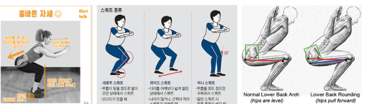 무릎과 엉덩이, 허벅지의 하반신 근육을 강화하는 운동입니다. 체중 조절과 자세 교정에 도움이 됩니다. 발을 어깨너비로 벌리고, 무릎이 발끝보다 앞으로 나오지 않게 하며, 엉덩이를 낮게 내려야 합니다.