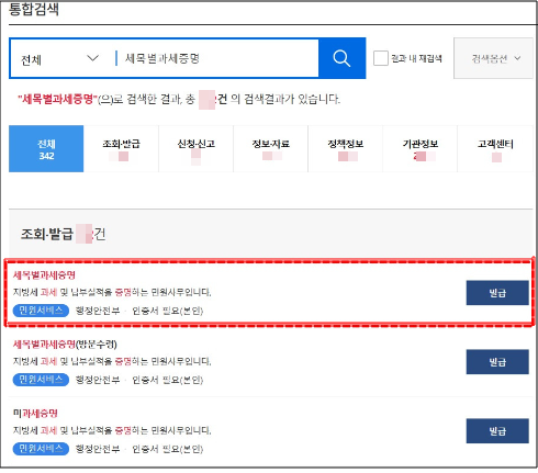 증명서 검색: 검색창에 '세목별 과세증명서'를 입력하고 해당 결과를 선택하세요.